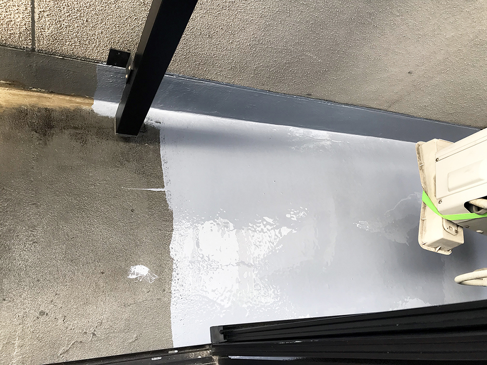 ■はじめにベランダの高圧洗浄を行い、下地の補修(コーキング、セメント)を行います。※雨漏りがひどい場合、高圧洗浄ができませんが、できる限り下地は綺麗にします。